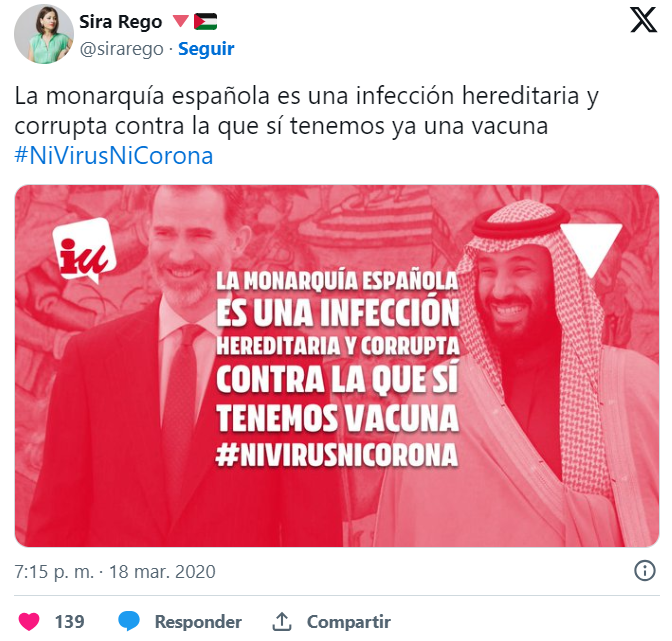 Durante la pandemia de coronavirus, Rego llegó a calificar a la monarquía española como "una infección hereditaria y corrupta contra la que sí tenemos una vacuna". Así lo escribió en un mensaje de Twitter, junto a la etiqueta #NiVirusNiCorona.