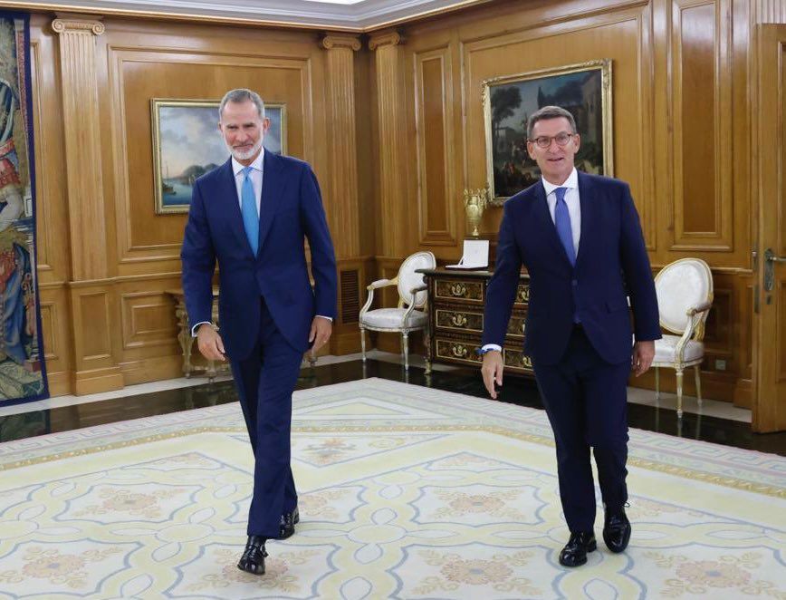 El rey Felipe VI propone a Alberto Núñez Feijóo, del Partido Popular, como candidato a la Presidencia del Gobierno. Una decisión que le ha comunicado a la presidenta del Congreso de los Diputados, Francina Armengol, en audiencia tras finalizar la ronda de contactos con los portavoces de todas las formaciones que han querido acudir a La Moncloa, tal y como publica Tiempo de Canarias.