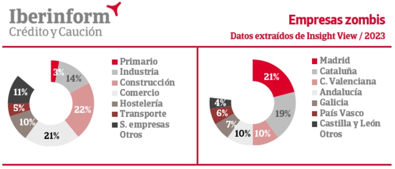 Por sectores de actividad, el mayor número de empresas zombis se encuadra en el de la construcción y la actividad inmobiliaria (22% del total), seguido por el comercio (21%) y la industria manufacturera (14%). En cuanto a su distribución territorial, casi la mitad de las empresas vulnerables se concentra en las comunidades de Madrid (21%), Cataluña (19%) y Valencia (10%) en línea con el mayor nivel de actividad empresarial de estas Comunidades Autónomas. Le siguen Andalucía, (9,9%), Galicia (6,7%), País Vasco (6,0%) Castilla y León (4,3%), Aragón (4,1%), Canarias (3,7%) y Castilla-La Mancha (3,2%).