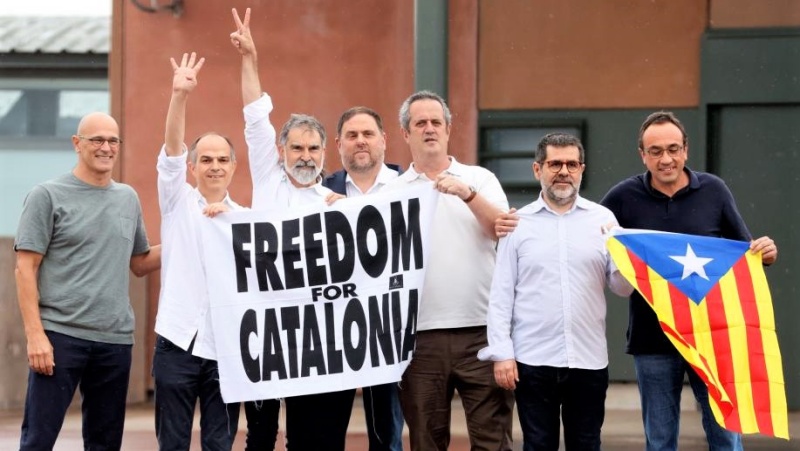 Una vez el Boletín Oficial del Estado (BOE) ha publicado el indulto y el Supremo ha ordenado su puesta en libertad, a las 12.06 horas han salido del centro penitenciario barcelonés de Lledoners, con una pancarta con el lema "Freedom for Catalonia" (Libertad para Cataluña) y una bandera independentista, el exvicepresidente Oriol Junqueras, los exconsellers Jordi Turull, Raül Romeva, Joaquim Forn y Josep Rull y y los exlíderes de la ANC Jordi Sànchez y de Òmnium Cultural, Jordi Cuixart.