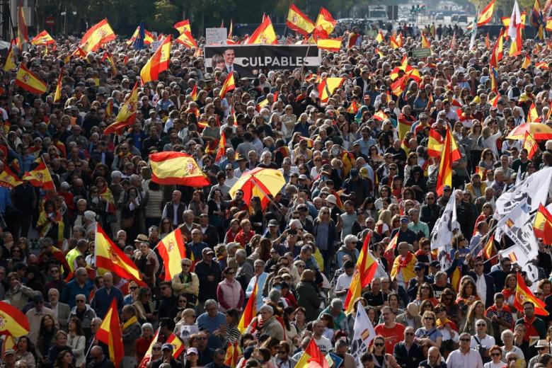 La Plaza de Castilla en Madrid se ha llenado de manifestantes para protestar contra el Gobierno de Pedro Sánchez, en estos momentos muy cuestionado por las tramas de corrupción vinculadas a miembros de su familia o cargos de su partido. La manifestación, convocada por más de cien asociaciones, pide "elecciones generales, ya" y está apoyada por Partido Popular y Vox. Con banderas de España y la Unión Europea, unido a pancartas en defensa de las víctimas del terrorismo o con la cara de Pedro Sánchez, la protesta ha transcurrido sin incidentes de ningún tipo. Santiago Abascal ha estado presente, así como varios cargos del PP. A la protesta también ha acudido el líder de Se Acabó La Fiesta, Alvise Pérez, tal y como ha podido confirmar este diario.