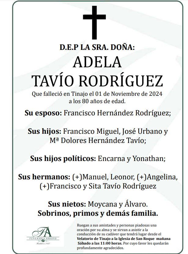 DEP Doña Adela Tavío Rodríguez que falleció en Tinajo el 01 de Noviembre de 2024 a los 80 años de edad.