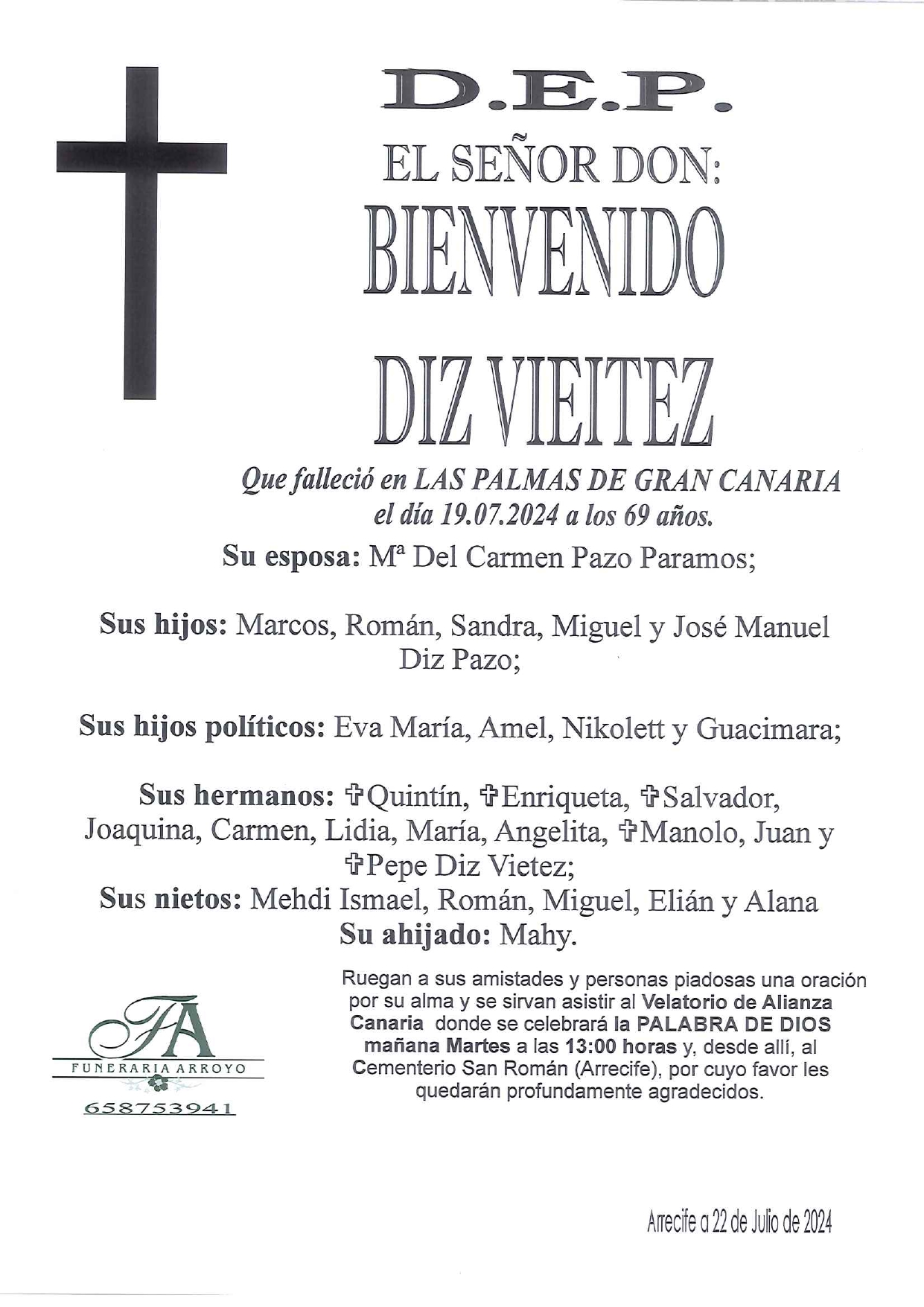 Descanse en paz el señor Don Bienvenido Diz Vieitez, que falleció en las palmas de Gran Canaria el día 19 de julio de 2024 a los 69 años.