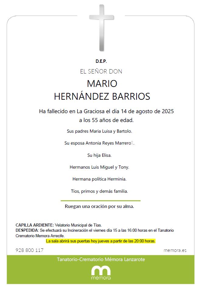 Descanse en paz Don Mario Hernández Barrios, que falleció en La Graciosa el día 14 de agosto de 2025, a los 55 años de edad