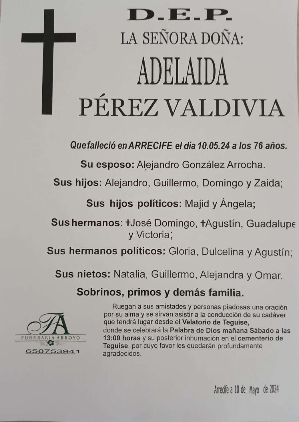 Ruegan a sus amistades y personas piadosas una oración por su alma y se sirvan asistir a la conducción de su cadáver que tendrá lugar desde el Velatorio de Teguise donde se celebrará la palabra de Dios mañana sábado a la una de la tarde (13:00 horas).