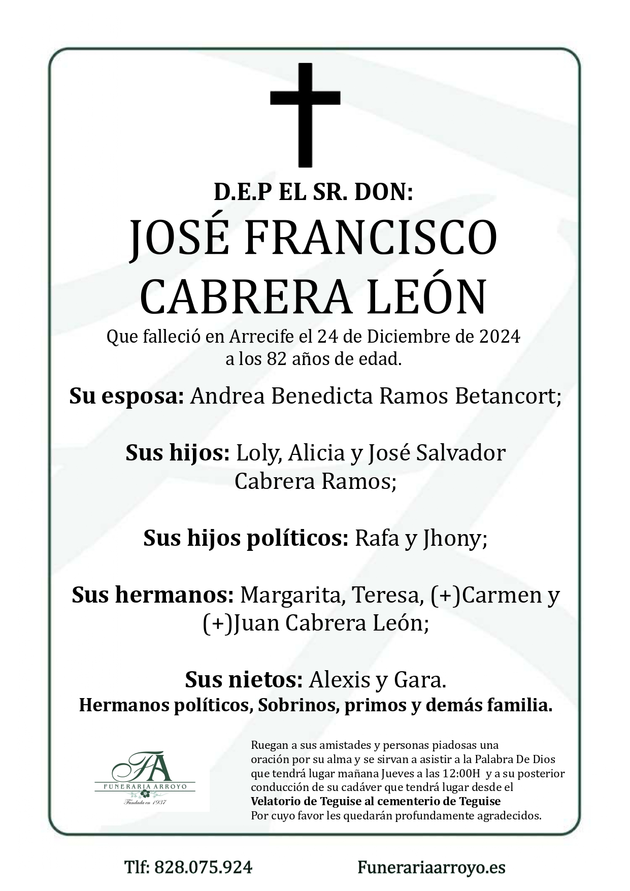 Ruegan a sus amistades y personas piadosas una oración por su alma y se sirvan a asistir a la Palabra de Dios que tendrá lugar mañana jueves a las 12:00 h y a su posterior conducción de su cadáver que tendrá lugar desde el Velatorio de Teguise al cementerio de Teguise.