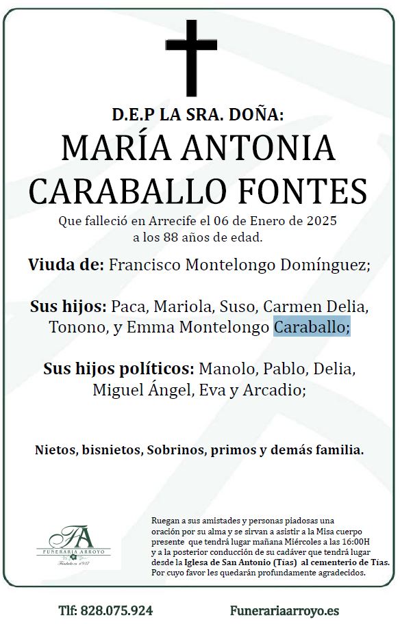 Ruegan a sus amistades y personas piadosas una oración por su alma y se sirvan a asistir a la Misa cuerpo presente que tendrá́ lugar mañana Miércoles a las 16:00H y a la posterior conducción de su cadáver que tendrá́ lugar desde la Iglesia de San Antonio (Tías) al cementerio de Tías. Por cuyo favor les quedaran profundamente agradecidos.