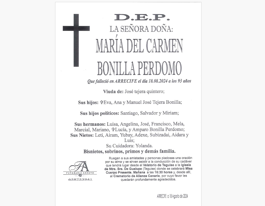 Descanse en paz la señora doña Maria del Carmen Bonilla Perdomo, que falleció en Arrecife el día 18 de agosto de 2024 a los 93 años.