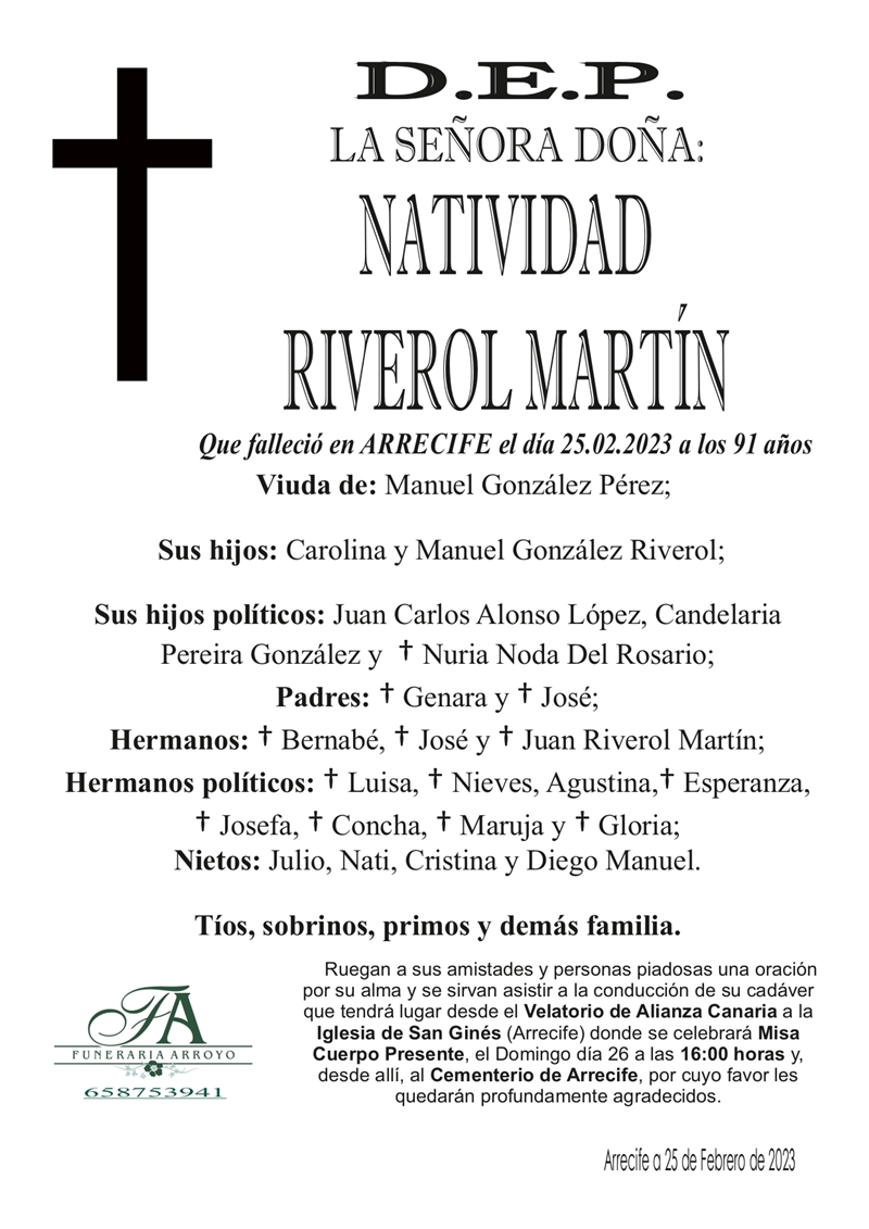 Ruegan a sus amistades y personas piadosas una oración por su alma y se sirvan asistir a la conducción de su cadáver que tendrá lugar desde el Velatorio de Alianza Canaria a la Iglesia de San Ginés (Arrecife) donde se celebrará Misa Cuerpo Presente, el Domingo día 26 a las 16:00 horas y, desde allí, al Cementerio de Arrecife, por cuyo favor les quedarán profundamente agradecidos.