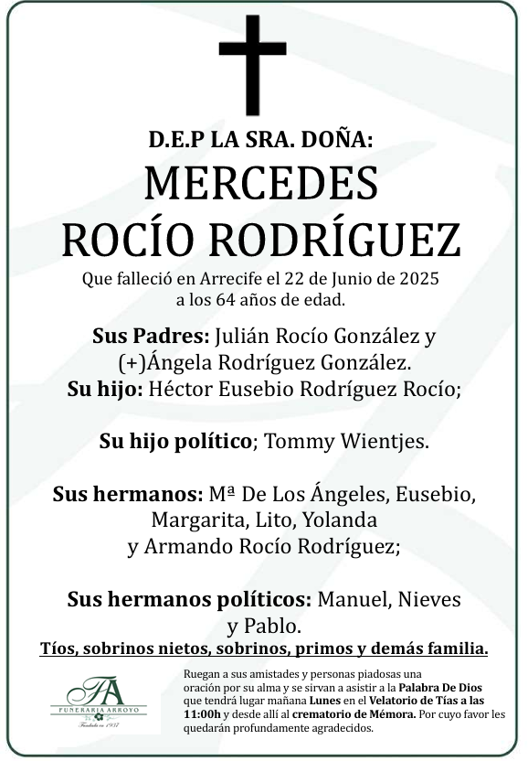 Descanse en Paz Mercedes Rodío Rodríguez que falleció en Arrecife el 22 de Junio de 2025 a los 64 años de edad.