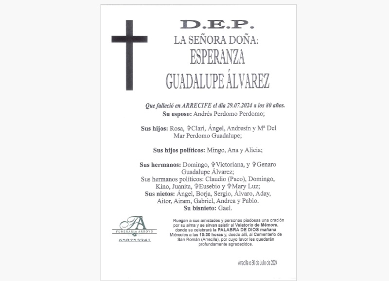 Ha fallecido el lunes 29 de julio, a los 80 años, Doña Esperanza Guadalupe Álvarez.