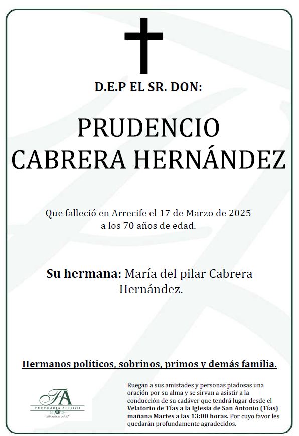 Ruegan a sus amistades y personas piadosas una oración por su alma y se sirvan a asistir a la conducción de su cadáver que tendrá lugar desde el Velatorio de Tías a la Iglesia de San Antonio (Tías) mañana Martes a las 13:00 horas. Por cuyo favor les quedarán profundamente agradecidos.