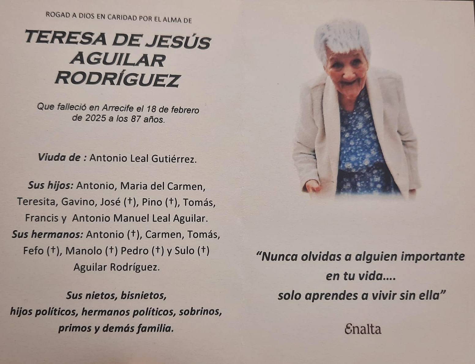 Descanse en paz Doña TERESA DE JESÚS AGUILAR RODRÍGUEZ que falleció en Arrecife el 18 de febrero de 2025 a los 87 años.
