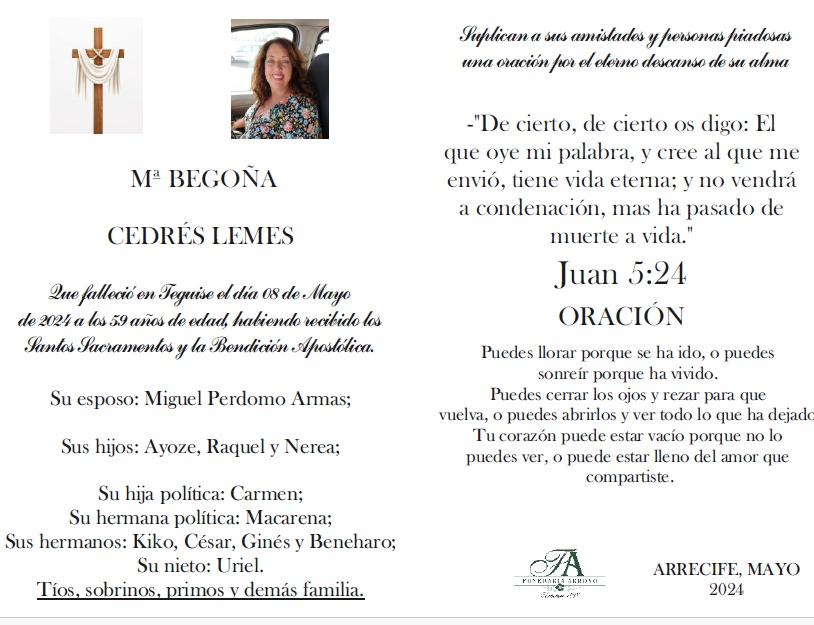 Doña María Begoña Cedrés Lemes fallecía ayer 8 de mayo en Teguise a los 59 años, habiendo recibido los Santos Sacramentos y la Bendición Apostólica.