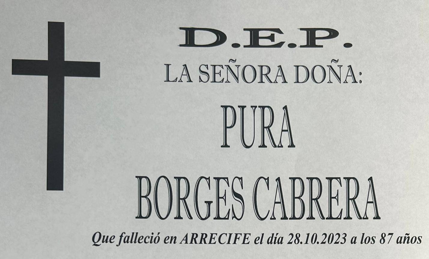 Este sábado ha fallecido en Arrecife Doña Pura Borges Cabrera, a los 87 años de edad. Viuda de Alfredo Rodríguez Cabrera.