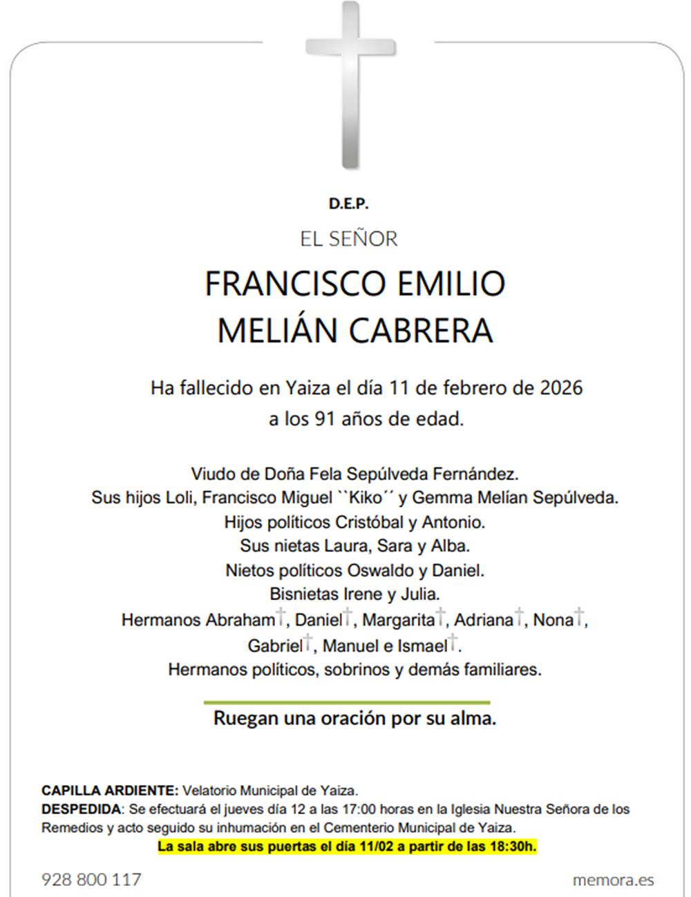 Francisco Emilio Melián Cabrera ha fallecido en Yaiza este 11 de febrero de 2026 a los 91 años de edad.