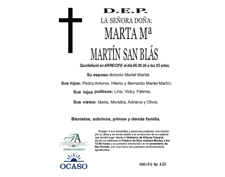 La señora Marta Martín San Blas fallecía este lunes 6 de mayo en Arrecife, a los 82 años de edad.