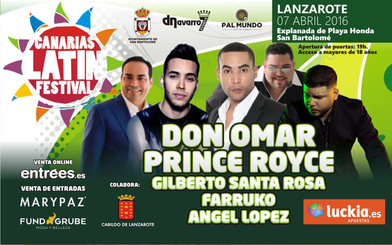 La productora DN7 Events en colaboración con el Ayuntamiento de San Bartolomé confirman que ya se encuentran a la venta las entradas para asistir al evento musical del año en Lanzarote. Canarias Latin Festival pretende reunir en un mismo escenario a artistas del género latino de la talla de Don Omar, Prince Royce, Gilberto Santa Rosa, Farruko y Ángel López entre otros, cantantes nominados a los importantes premios Billboard latinos.