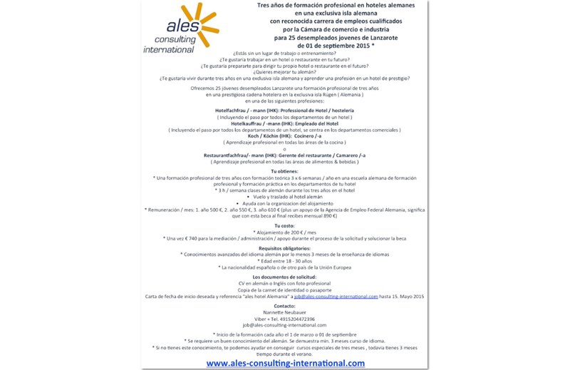 Para mas informacion puede consultar la página web www.ales-consulting-internacional.com o ponerse en contacto con Nannette Neubauer, en el email job@ales-consulting-international .com