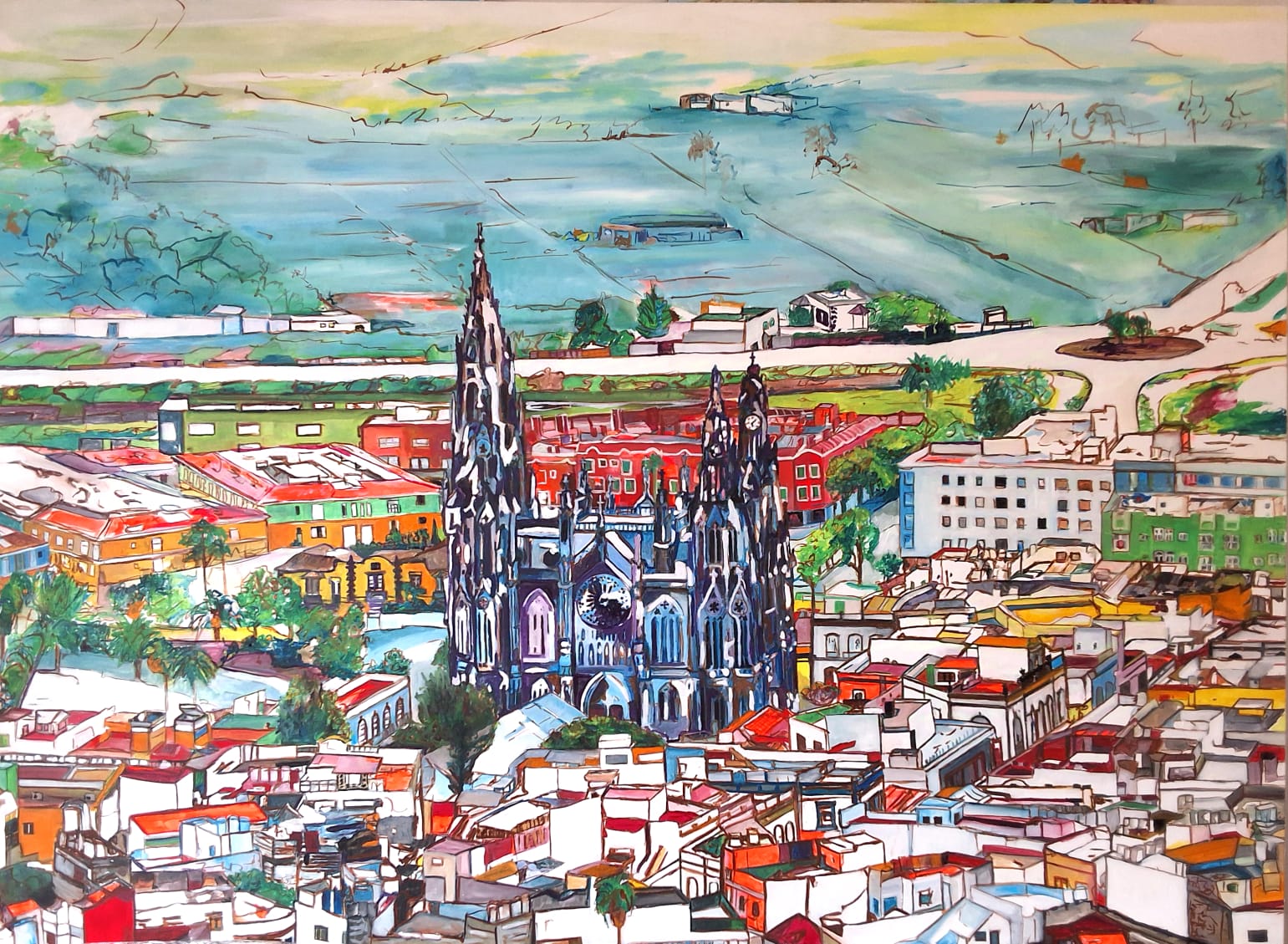 Imparable en su búsqueda por plasmar la belleza con sus pinceladas minuciosas, en sus cuadros de gran tamaño, ya sea con oleos, acrílicos, arenas o tintes, la pintora Alicia Rodríguez Riquero llega hasta Arucas.