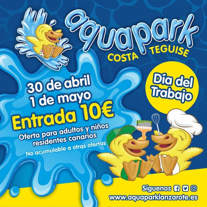 Aquapark Costa Teguise ha lanzado una oferta muy especial para pasar en familia del Día del Trabajador. Tanto este domingo, 30 de abril, como el lunes, 1 de mayo, los residentes canarios podrán entrar a las instalaciones a un precio de diez euros.