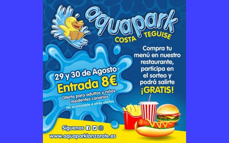 Aquapark Lanzarote lanza una oferta para residentes canarios, tanto niños como adultos, de cara a los próximos 29 y 30 de agosto, en los que podrán disfrutar del parque acuático por tan sólo 8 €, en horario de 11 a 17 horas.