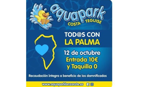 Aquapark lanza una oferta muy especial para este 12 de octubre: la entrada al parque será de 10 euros y todo lo que se recaude durante la jornada, tanto en taquilla, como en las ventas del restaurante y la tienda, será donado a los damnificados por el volcán en erupción en La Palma.