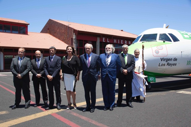 La aerolínea Binter bautizó este jueves un nuevo avión, modelo ATR 72-600, con el nombre Virgen de los Reyes, en honor a la patrona de El Hierro. El acto celebrado en el aeropuerto insular, contó con la presencia de la presidenta del Cabildo de El Hierro, Belén Allende, el consejero de Agricultura, Ganadería Pesca y Aguas del Gobierno de Canarias, Narvay Quintero, y el presidente de la compañía, Pedro Agustín del Castillo, junto al obispo de la Diócesis Nivariense, Bernardo Álvarez Afonso, que ejerció como padrino del bautizo.