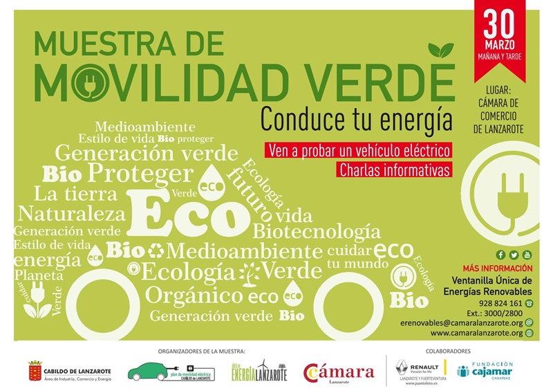 El jueves 30 de marzo, en la Cámara de Comercio de Lanzarote, se celebra una Muestra experiencial de Movilidad Verde, que tiene como objetivo que todos los que no conocen el funcionamiento del vehículo eléctrico puedan conocer sus ventajas, subirse a uno y conducirlo. Una muestra práctica para que particulares y empresas se acerquen, toquen, conduzcan y conozcan, además, todo tipo de productos destinados a suministrar energías renovables, instalaciones de autoconsumo de última generación, baterías pioneras en el mercado y puntos de recarga.