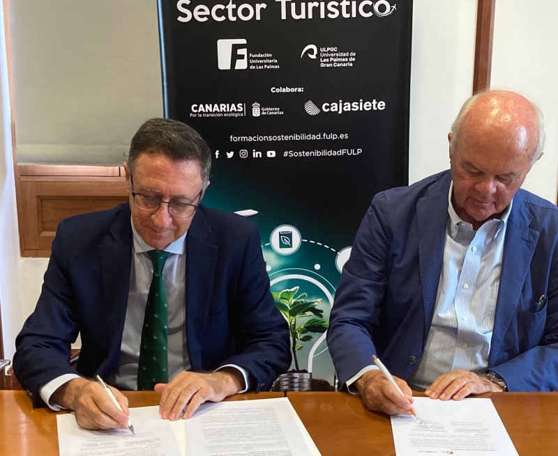 Los presidentes de Cajasiete y del Patronato de la Fundación Universitaria de Las Palmas, Fernando Berge y Alberto Cabré respectivamente, han firmado un acuerdo mediante el cual la entidad financiera ofrece 5 becas para realizar el experto en Sostenibilidad en el Sector Turístico promovido por la FULP y aprobado por la ULPGC y además Cajasiete continuará, un año más, colaborando con el programa Enseñar para Emprender (EPE).