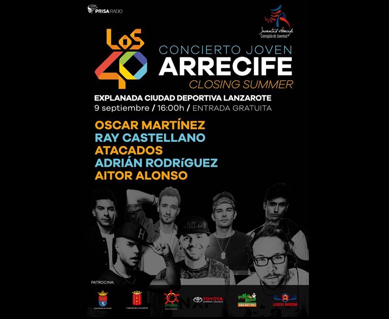 Con el patrocinio de la Concejalía de Juventud del Ayuntamiento de Arrecife, y de la mano de Los40, el próximo sábado 9 de septiembre, llega a Arrecife el concierto de fin de verano más esperado. Con entrada totalmente gratuita y las actuaciones de las estrellas de panorama musical más destacadas del momento entre los artistas jóvenes.