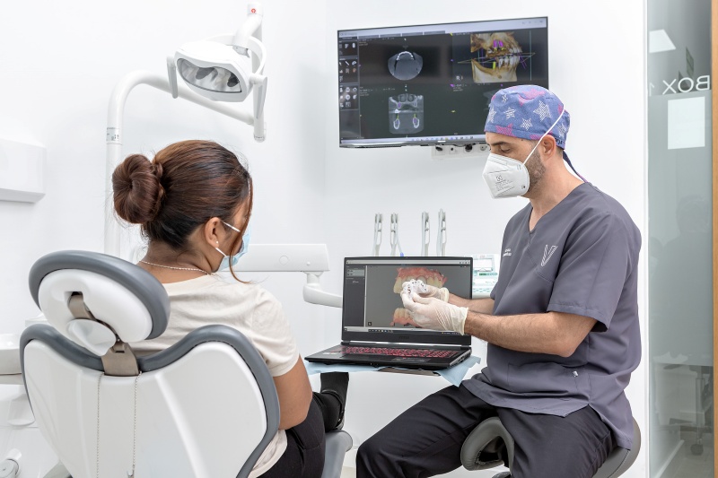 Se trata de una técnica que permite colocar los implantes dentales en el lugar exacto. Para ello, la planificación previa ocupa un lugar fundamental. De la mano de un programa de ordenador de última generación y una prueba radiológica en 3D, planificamos el caso, visualizando las estructuras óseas y blandas de la boca del paciente. Sobre estas imágenes, colocamos virtualmente los implantes. Con toda esta información, elaboramos una férula quirúrgica a medida. Así, conseguimos colocar los implantes en la zona exacta previamente estudiada.