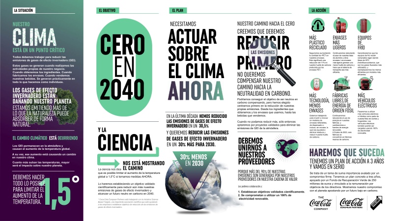 Según afirma Damian Gammell, CEO de Coca-Cola European Partners, en la presentación de estos objetivos a escala internacional, “nuestra visión siempre ha sido ofrecer productos elaborados de manera sostenible, pero hoy reconocemos una mayor urgencia de abordar el cambio climático, uno de los desafíos más serios y complejos a los que se enfrenta nuestra sociedad y nuestro planeta. Por esta razón hemos desarrollado un ambicioso plan para reducir nuestras emisiones de gases de efecto invernadero que, con objetivos de reducción de emisión de carbono, avalados científicamente, respalde nuestra ambición y trace el avance de nuestras acciones”.