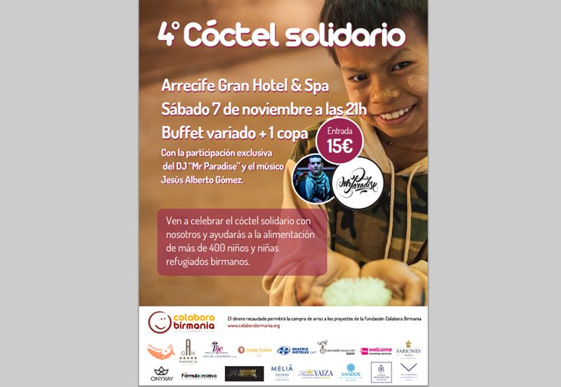 El Arrecife Gran Hotel acogerá el próximo sábado 7 de noviembre un cóctel solidario a favor de la Fundación Colabora Birmaria. El dinero recaudado se destinará a la compra de arroz para ayudar a la alimentación de más de 400 niños refugiados birmanos.