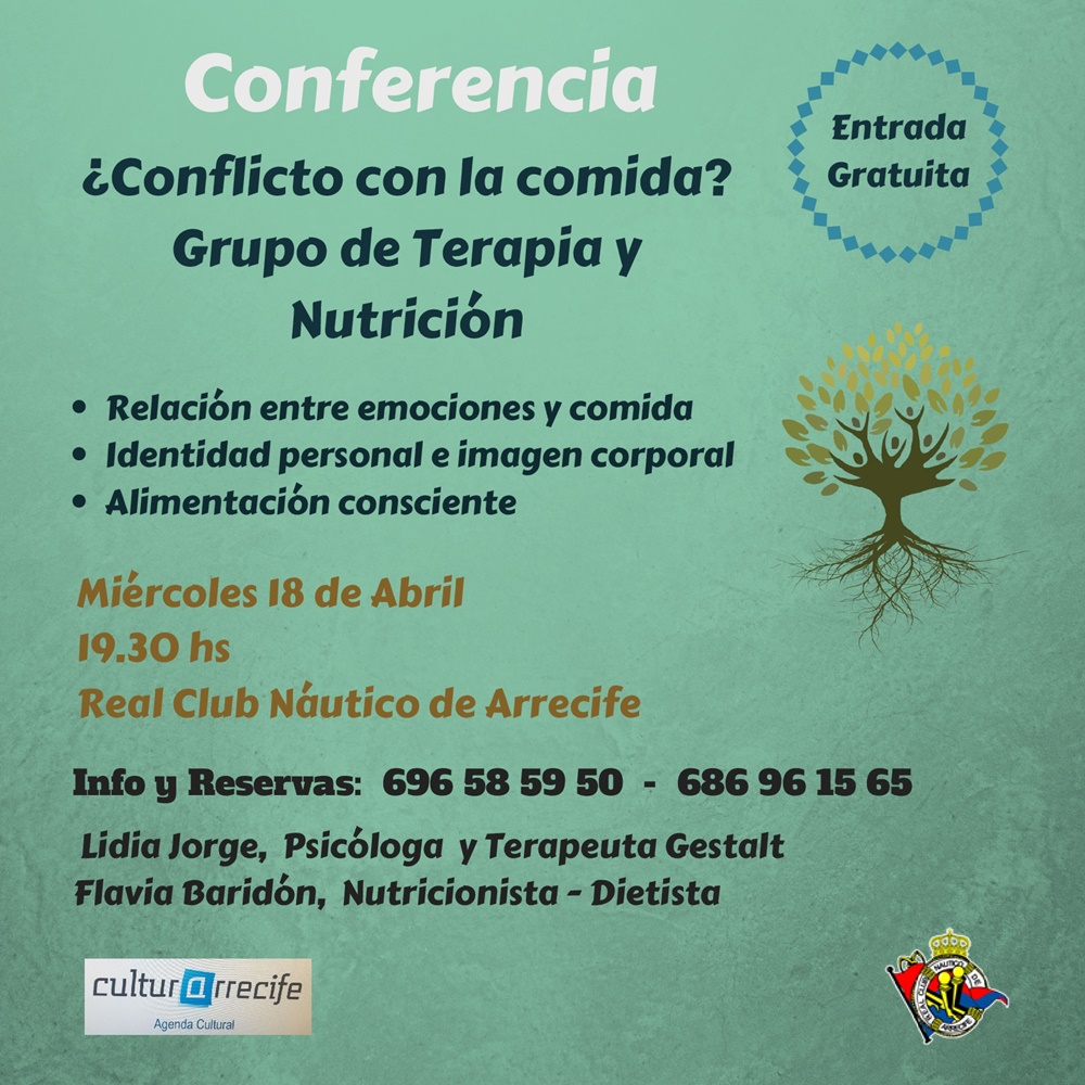 Hoy miércoles 18 de abril la psicóloga Lidia Jorge y la nutricionista Flavia Baridón, ofrecen una conferencia gratuita en el Club Náutico de Arrecife a las 19.30 horas que lleva por título '¿Conflicto con la comida? Grupo de Terapia y Nutrición'.