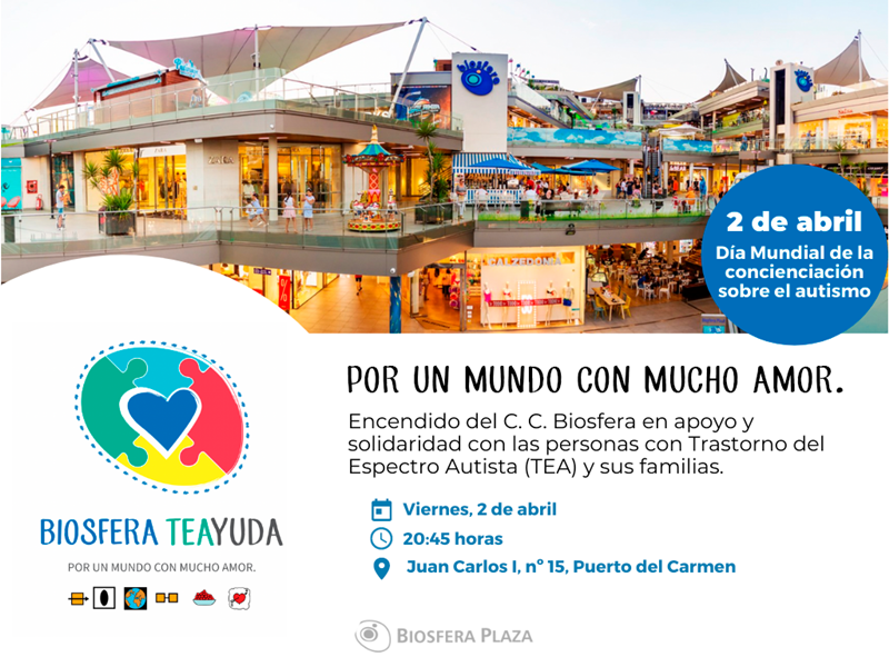 El Centro Comercial Biosfera Plaza quiere invitarles al encendido que realizará en sus instalaciones el próximo viernes, 2 de abril (Día Mundial de Concienciación del Autismo) a las 20:45 horas, en apoyo y solidaridad al colectivo de personas con Trastorno del Espectro Autista (TEA) y sus familias.