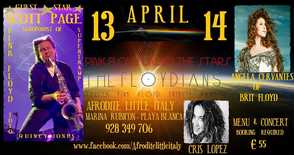 The Floydians, una de las mejores bandas que rinden tributo a Pink Floyd alrededor del mundo, actuará los días 13 y 14 de abril junto al que fuera saxofonista del grupo británico, Scott Page, acompañados en ambas citas, por las cantantes Ángela Cervantes, Cris López y el saxofonista Mr. Brown. La cena-concierto tendrá lugar en la terraza del restaurante Afrodite Little Italy, en el puerto deportivo Marina Rubicón, en Playa Blanca.