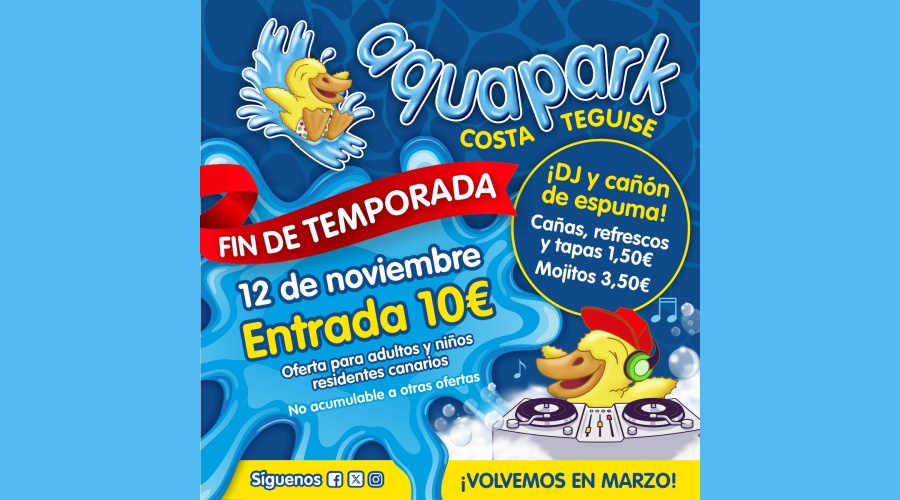 Aquapark Costa Teguise cierra la temporada este 12 de noviembre con una oferta especial dirigida a niños y adultos residentes en Canarias. Por tan sólo 10 euros, disfrutarán de las atracciones del parque, así como de música de un DJ en directo y un cañón de espuma. Además contarán con una amplia oferta de tapas, cañas, refrescos y mojitos a precios imbatibles.
