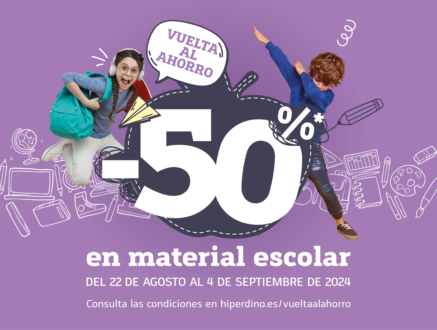 HiperDino, fiel a su lema Los mejores precios de Canarias, continúa ofreciendo a sus clientes campañas de ahorro, en esta ocasión, 50% de descuento en material escolar, para facilitar la vuelta al cole a las familias con alguno de sus miembros en etapa escolar o académica.