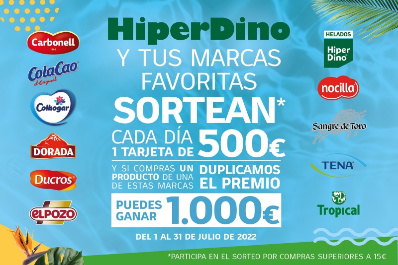 HiperDino celebra la llegada del verano con sorteos diarios de hasta 1.000 euros entre los clientes que compren en cualquiera de sus establecimientos HiperDino, SuperDino, HiperDino Express y en el canal de venta online hiperdino.es.