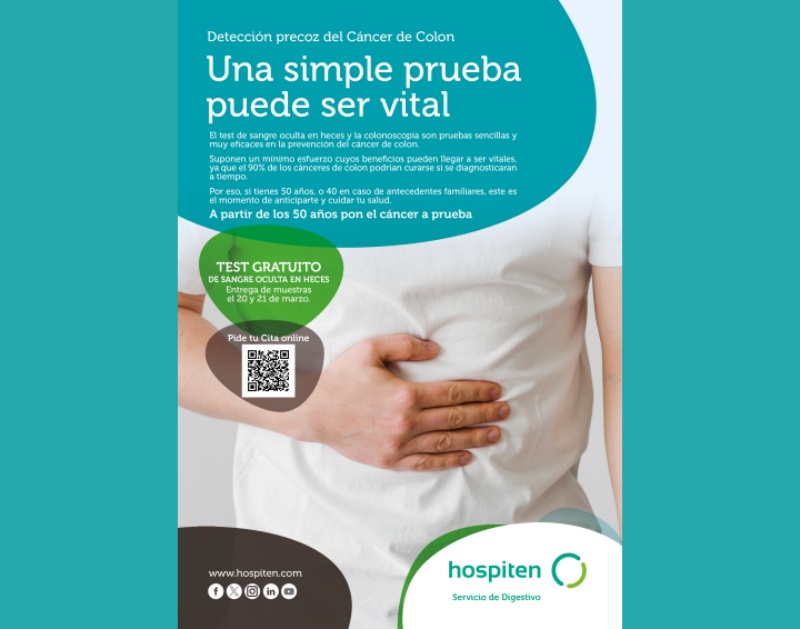 Hospiten lanza la novena edición de su campaña anual sobre prevención y detección del cáncer de colon. Con motivo del Día Internacional del Cáncer de Colon, que tiene lugar el 31 de marzo, la red hospitalaria ofrece pruebas gratuitas a las personas interesadas con el objetivo de recordar la importancia de la detección precoz de esta patología.