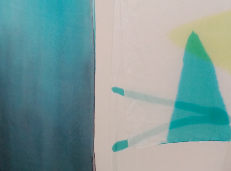 Algunas piezas se realizan con algodón o con distintas clases de seda, mientras que otras combinan ambos materiales. María explica: “La seda me interesa en especial por sus cualidades de transparencia, ligereza y delicadeza; y porque constituye un soporte ideal donde los colores vibran con fuerza y a veces parece como si flotaran en el aire”.