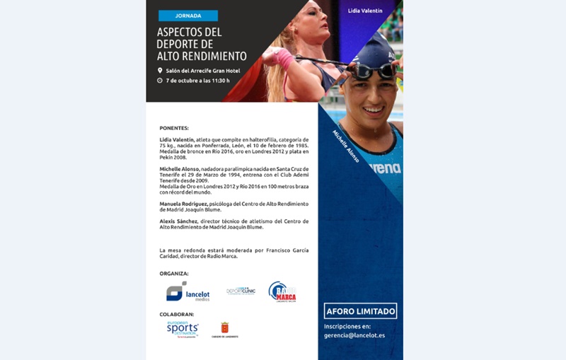 Los salones del Arrecife Gran Hotel acogerán este viernes 7 de octubre, a las 11:30 horas, una Jornada sobre "Aspectos del Deporte de Alto Rendimiento", organizada por Lancelot Medios, Radio Marca Lanzarote 104.5 FM y DeportClinic, con la colaboración de European Sports Destination y el Cabildo de Lanzarote.