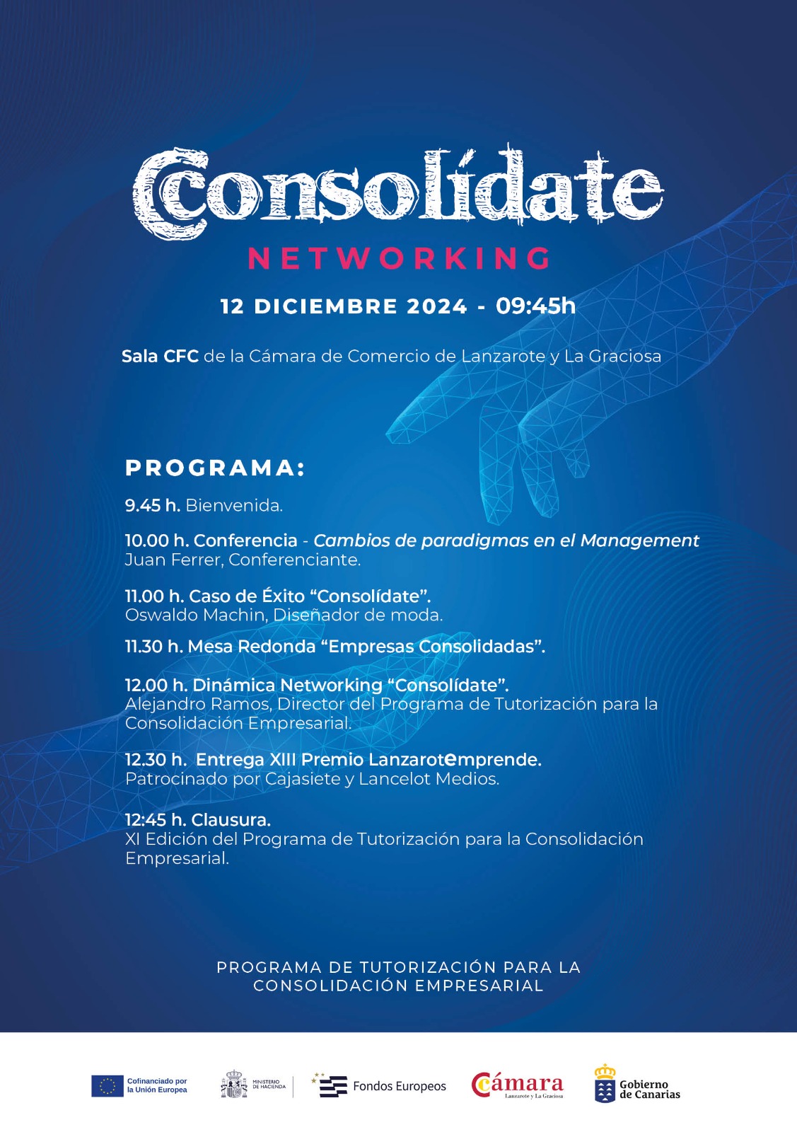 El evento, que tendrá lugar en las instalaciones de la Cámara, contará con la participación de empresas de ediciones anteriores y un encuentro de networking para fomentar la creación de la Comunidad Consolídate. El consultor, formador y conferenciante especializado en gestión del cambio, Juan Ferrer, ofrecerá una conferencia dirigida tanto a los participantes del programa como al público general interesado. Puede inscribirse aquí.