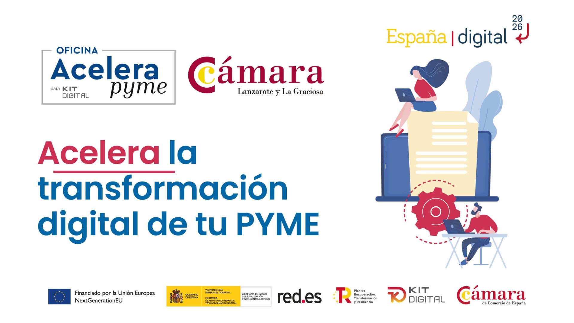 Las Oficinas Acelera pyme para Kit Digital puestas en marcha por Red.es, entidad pública adscrita al Ministerio de Asuntos Económicos y Transformación Digital a través de la Secretaría de Estado de Digitalización e Inteligencia Artificial, con la colaboración de Cámara de España, tienen como objetivo impulsar la transformación digital de las pequeñas y medianas empresas, micropymes y autónomos. Las actuaciones, están financiadas por el Plan de Recuperación, Transformación y Resiliencia a través de los fondos NextGenerationEU, en el marco de la agenda España Digital 2026 y el Plan de Digitalización de Pymes 2021-2025.