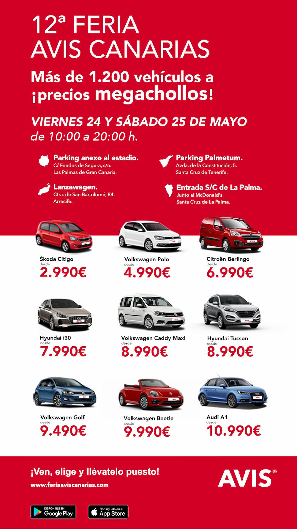 Vuelve la Feria de vehículos de ocasión de Avis Canarias con sus tradicionales megachollos. Este fin de semana los días 24 y 25 de mayo, Avis Canarias ofrecerá la oportunidad única de conseguir un vehículo seminuevo: Volkswagen, Volkswagen Comerciales, Škoda, Audi, Citroën, Hyundai y Honda; todos ellos con un año de garantía y a un precio único.