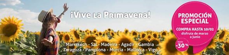 "¡Escápate con nuestra promoción especial! Recibe la primavera en destinos internacionales: Madeira, Sal, Marrakech, Gambia y Agadir, o nacionales: Pamplona, Zaragoza, Murcia, Mallorca, y Vigo con hasta un -30% de descuento". Esta es la nueva promoción de esta web de viajes que ofrece paquetes de vuelo y hotel a destinos nacionales e internacionales a unos precios increíbles de los que podrán beneficiarse todos sus usuarios.