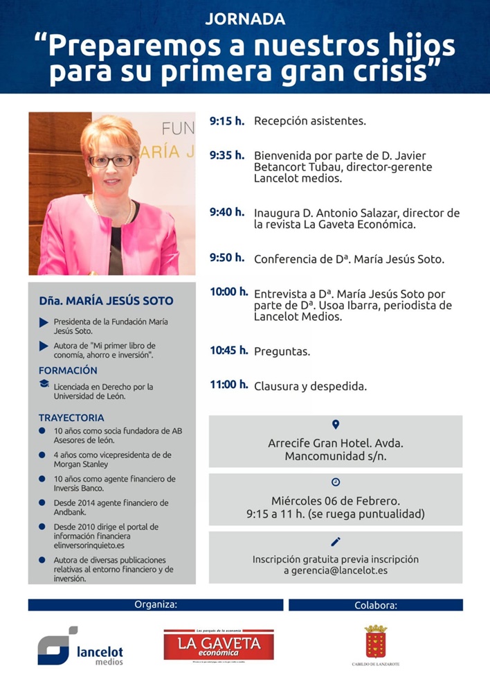 El Arrecife Gran Hotel volverá a acoger mañana miércoles por la mañana una nueva jornada. En esta ocasión bajo el nombre "Prepararemos a nuestros hijos para su primera gran crisis", destacando la conferencia y posterior entrevista con María Jesús Soto, licenciada en Derecho y autora del libro "Mi primer libro de economía, ahorro e inversión".