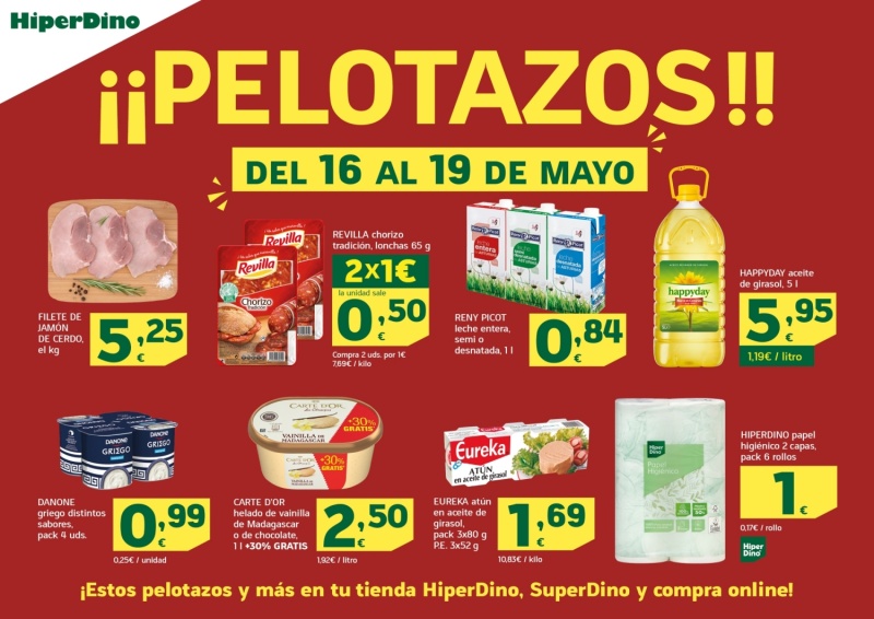 HiperDino ofrece a sus clientes la posibilidad de adquirir primeras marcas a precios más competitivos que otros de marca blanca, para lo que ha lanzado una nueva campaña de pelotazos. Se prolongará desde el 16 hasta el 19 de mayo en todos sus establecimientos HiperDino, SuperDino y en el canal de compra online.