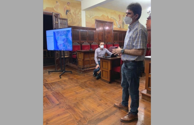 En la imagen. José Antonio Melián y Fernando Capote, representantes de Endesa en La Palma, explican a los vecinos mediante proyección cómo se va a reponer el anillado eléctrico de la Isla.